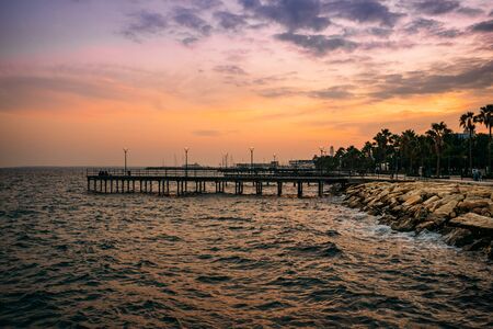 Pier at Molos Promenade park at sunset in Limassol city ,Cyprus. Beautiful evening mediterranean sea resort.