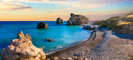 Famous touristic landmark Aphrodite's rock and empty pebble beach Petra tou Romiou in sunset, Cyprus