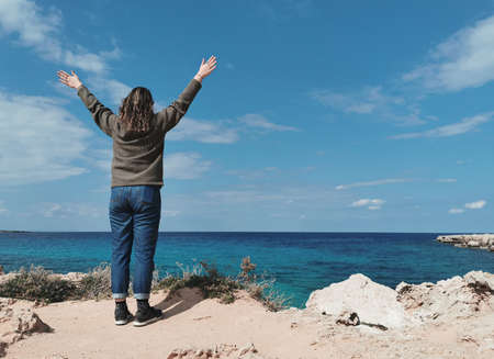 Back view of a woman with raised arms standing on rocky coast enjoying the sea. Freedom relaxing in nature