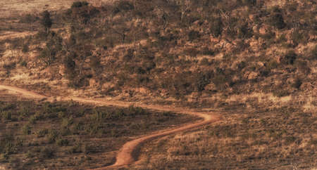 The plains of endless arid bush landscape stretching out towards hills on the horizon, with a single road running through the valley. Pilanesberg Game Reserve, South Africa