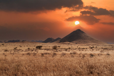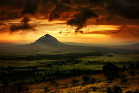 Stunning sunset over an African savanna with a majestic mountain silhouette.