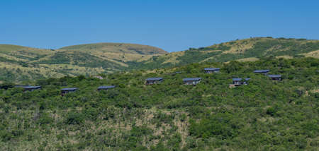 Green grass hill and scattered trees in Hluhluwe park, South Africa, African landscape, blue sky, fluffy clouds