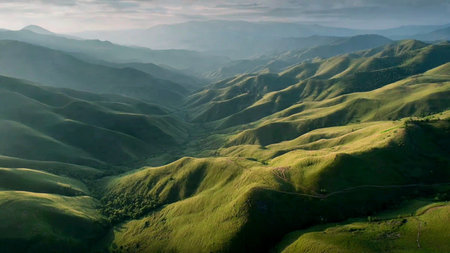 Aerial view of the undulating hills of Sumba Island, Indonesia, showcasing vibrant green grass, a winding path, and the natural beauty of the Indonesian landscape