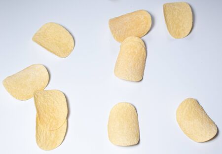 Potato chips scattered on a white isolated background