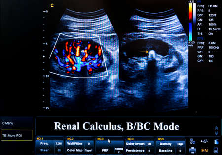 Modern echocardiography (ultrasound) machine monitor. Colour image. New hospitl equipment. Renal Calculus.