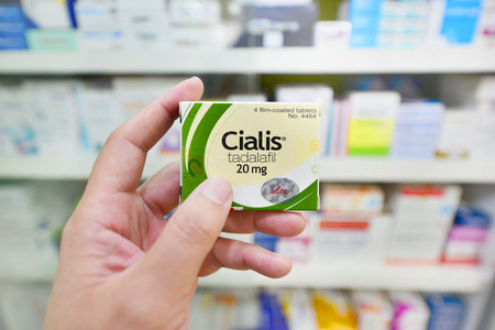 BANGKOK ,THAILAND - FEB 4: Cialis packaging in hand on February 4, 2017 in drugstore Bangkok. Cialis was originally developed by Eli Lilly as an erectile dysfunction drug.