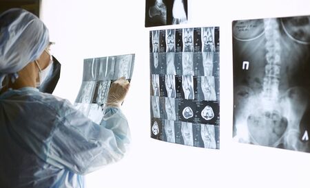 Medical equipment. Doctor looking MRI picture. Background