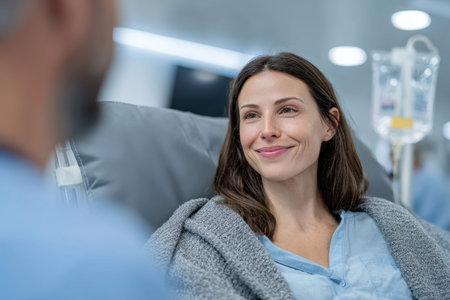 woman lying in a modern hospital bed receiving IV therapy..