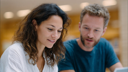 Two business colleagues are working together, analyzing data on a laptop and leveraging the power of artificial intelligence to develop innovative solutions for their project