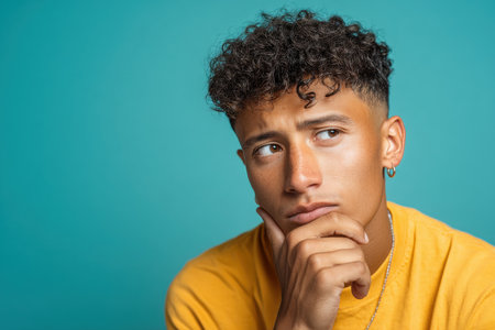 Curly-haired person with an earring in a yellow shirt poses thoughtfully, resting chin on hand, eyes looking left. Expression suggests curiosity or contemplation, with focus on face