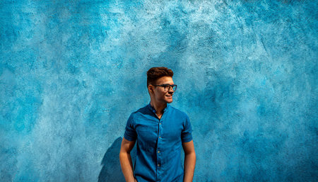 A man wearing a denim jacket and sunglasses leans against a vibrant blue wall embodying a relaxed and cool urban style in bright daylight.