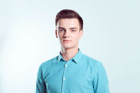 Adult handsome man in blue shirt standing on light background looking seriously at camera