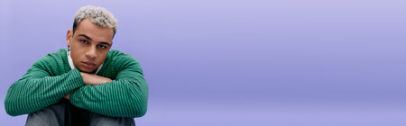 A young African American man showcases his fashion sense in a vibrant purple setting, banner