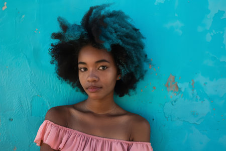 A beautiful Afro young lady with vibrant blue hair and a bright pink top poses confidently against a plain turquoise background