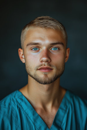 A young Russian man named Sergey Ivanov, around 20 years old, displays his blue eyes and short blond hair. He wears a long blue hospital gown, presenting a calm demeanor.