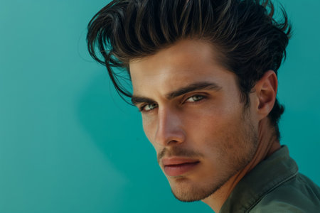 Young stylish man with modern quiff hairstyle and trendy fashion, care, and grooming, posing for a close-up headshot in a contemporary barber salon