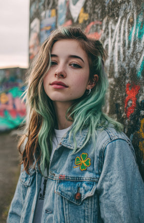 Outdoor portrait of a teen girl with teal green hair streak wearing a denim jacket with shamrock patch, standing by a graffiti wall. Youth culture and street style concept.