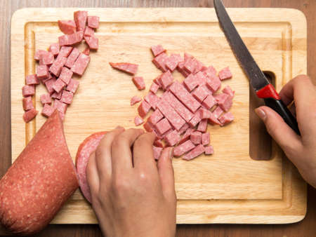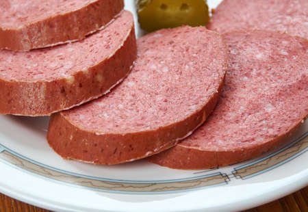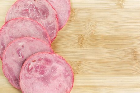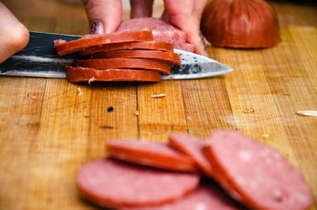 Bologna sausage thin sliced cut with knife
