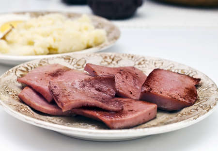 Appetizing thin slices of boiled pork ham, closeup view