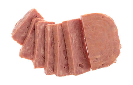 Top view of several thick slices of a whole canned ham isolated on a white background.