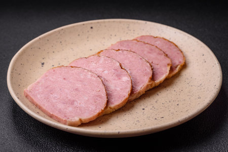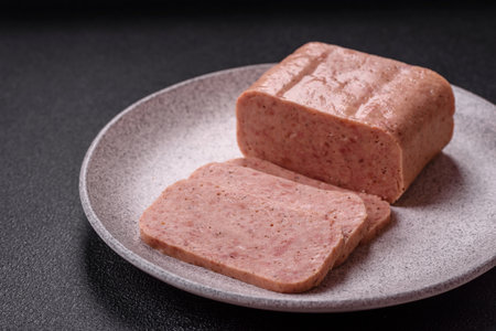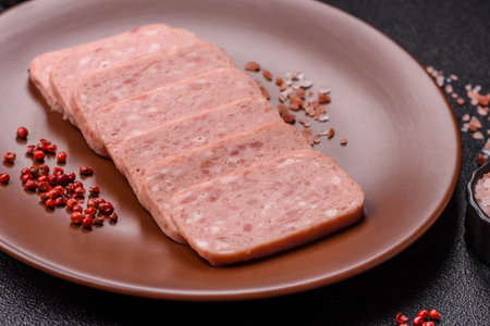 Canned ham, meat, pork, with spices and salt, slices on a dark concrete background