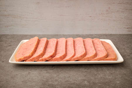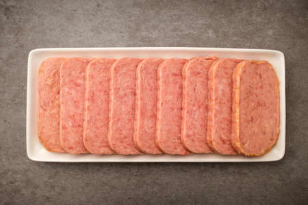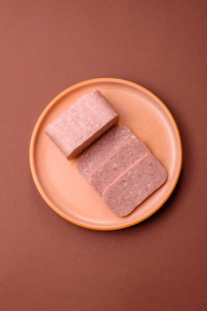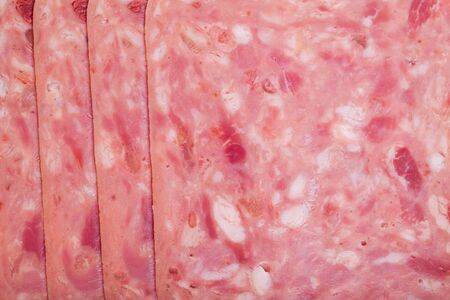 Spiced ham slices, canned meat for lunch sandwiches. Spiced ham as a food backdrop for your design.