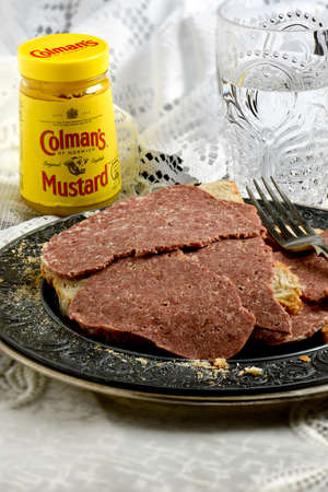 close up of canned meat on a chopping board on table
