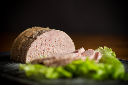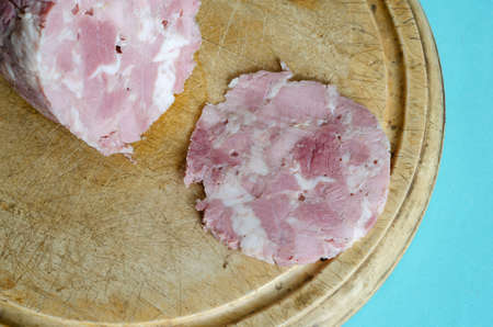 Homemade chopped ham on a wooden cutting board. A piece of delicious pork ham without the casing. Ready-to-eat homemade food.