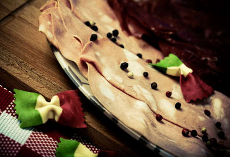 Food, meat, ham sliced in slices for the festive table. Ham with spices, fresh healthy food