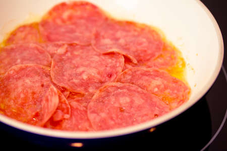 slices of salame (sausages) cooking in a pan