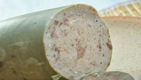 English liver sausage, creamy to firm cooked sausage containing ground pork liver