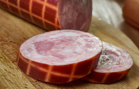 sliced boiled sausage with slices of whole meat, close up