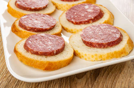 Few sandwiches with smoked sausage in white glass plate on wooden table
