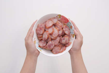 Thai Foods,Pork sausages are cut into many pieces, put in a container.