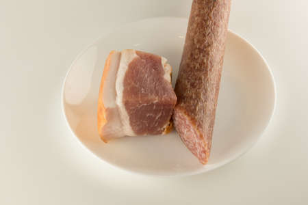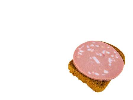 Black bread sandwich with pork sausage and lard on a white plate. Black bread. Meat sausage. Pig fat. Pork product. Fatty food. Non vegetarian food. Meat dish. Home kitchen. White background.