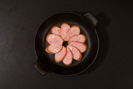 Sliced sausage in a frying pan on a black background.