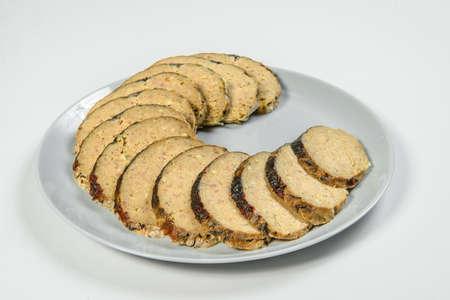 Jewish traditional gefilte fish slices served on Gray serving plate isolated on light background. Ukrainian And Russian national dish isolation. Celebration rustic fish food