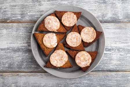 Sausage and toast on a gray plate on a gray wooden background. Top view, flat lay, close up.