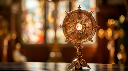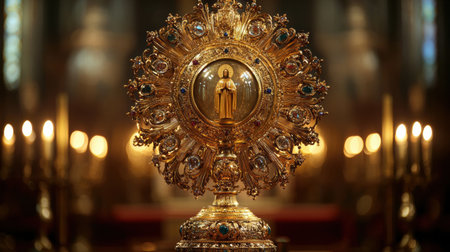 golden monstrance holding sacred relic radiates soft lighting of church, showcasing its beautiful filigree and vibrant gemstones divine elegance