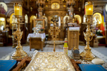 Bucharest, Romania - May 24, 2020: Details with accessories in an Orthodox Church needed for an Orthodox baptism. Baptismal font.