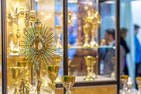 BOLOGNA, ITALY - FEBRUARY 18, 2019: lights are enlightening monstrances at stand of GIOACHINI, in DEVOTIO Religious products and service exhibition