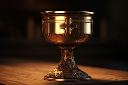 Bronze cup of chalice on wooden table in church.