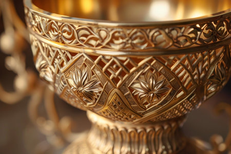 The intricate design of a golden trophy with engraved details. --ar 3:2 Job ID: b46083d2-0629-46a3-b848-75142ad69aae