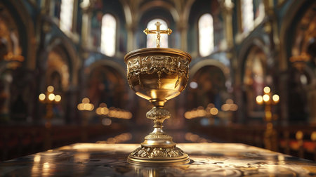 A golden chalice sits on an ornate table within a grand cathedral, illuminated by the light from stained glass windows.