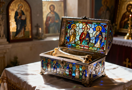 Ancient Christian reliquary box adorned with stained glass icons, containing sacred bones inside a sunlit historic church interior.