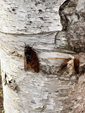 Brood X group of periodical cicadas emerge synchronously every 17 years. This group is known as Great Eastern Broods. Newly emerged adult swinging wing before flying off a wooden stick