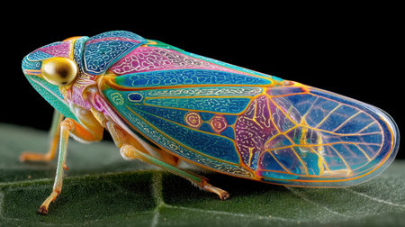 This stunning macro photograph features a colorful cicada perched on a leaf, showcasing vibrant colors and intricate wing patterns, set against a dramatic black background.