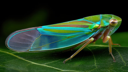 Delicate insect captured in ultra macro, body and wings of the leafhopper shimmering in natural light