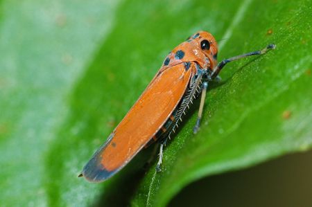Orange Leafhopper standing on green leaf, planthoppers, treehopper or spittlebug, Nature blurred background, macro concept and selective focus, Insect Thailand.