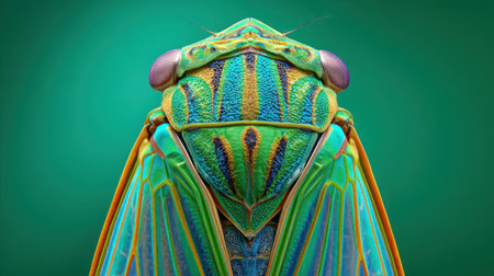 This close-up image features a stunning cicada showcasing its vibrant colors and intricate patterns against a soft green backdrop, highlighting its unique beauty in nature.